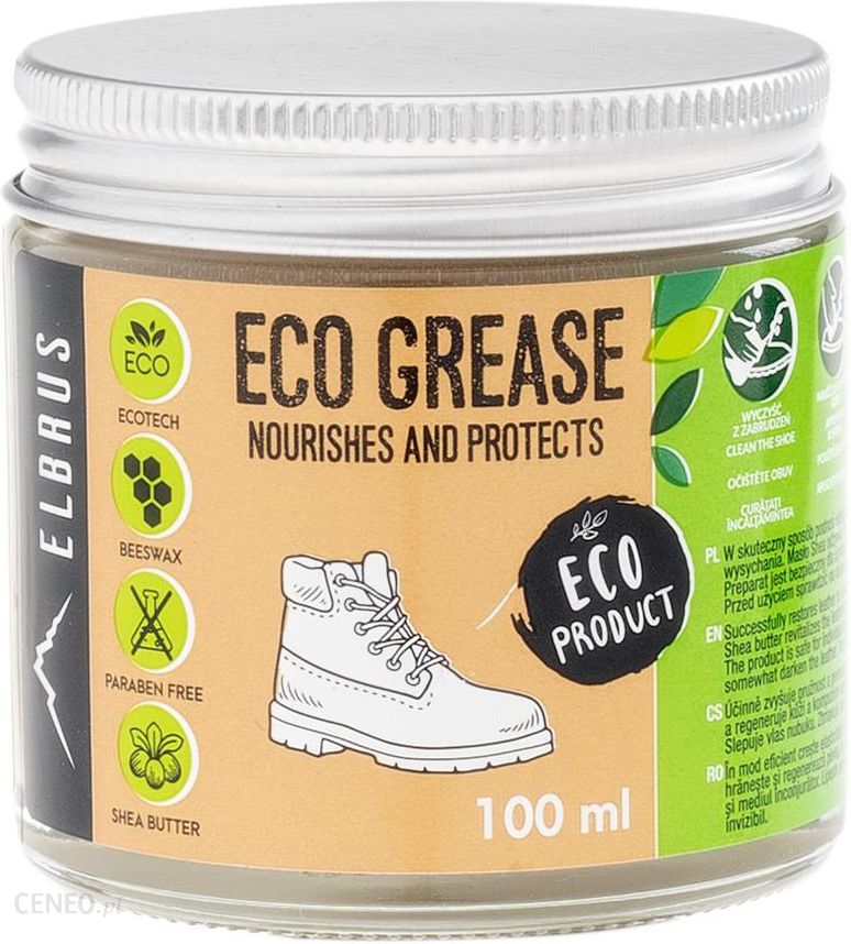 ECO GREASE POJEMNOŚĆ: 100 ML SKŁAD IMPREGNATU: MASŁO SHEA, WOSK CARNAUBA, WOSK PSZCZELI SPECYFIKACJA: – ZMIENIA KOLOR OBUWIA – DŁUGI CZAS OCZEKIWANIA NA WYSCHNIĘCIE PRODUKTU – EKOLOGICZNY IMPREGNAT
