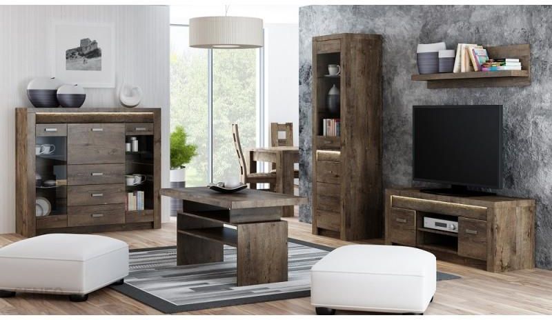 System Indianapolis dzięki dostępności 3 ciekawych kolorów znajdzie uznanie u najbardziej wymagających klientów. Elementem wyróżniającym system Indianapolis jest niewątpliwie wstawka drewnianej płyty, którą dodatkowo można podświetlić oświetleniem LED montowanym pod blatem co nadaje wnętrzu niebanalnego klimatu. Metalowe uchwyty dopełniają efektu ponadczasowej stylistyki zestawu a połączenie z kulkowymi prowadnicami z technologią pełnego wysuwu utwierdzają w jej solidności wykonania. Wymiary elementów zestawu: (szerokość/wysokość/głębokość):Witryna I-4 (S/W/G): 56/192/42 cm(szerokość/wysokość/głębokość):Komoda I-8 (S/W/G): 137/122/42 cm(szerokość/wysokość/głębokość):Stoli RTV duży I-9 (S/W/G): 137/53/42 cm(szerokość/wysokość/głębokość):Półka I-11 (S/W/G): 120/32/18 cm(szerokość/wysokość/głębokość):Ława I-13 (S/W/G): 120/60/60 cmDODATKOWE INFORMACJE:Meble wykonane są z wysokiej jakości płyty wiórowej laminowanej odpornej na zarysowania, z obrzeżami typu ABS.Meble dostarczane są w paczkach do samodzielnego montażu, wraz z instrukcją oraz okuciami.