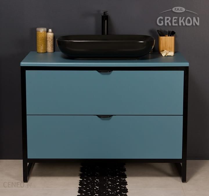 Szafka łazienkowa w niebieskim, matowym kolorze z serii NEW YORK. Stelaż wykonany z aluminium malowany proszkowo na czarny mat.